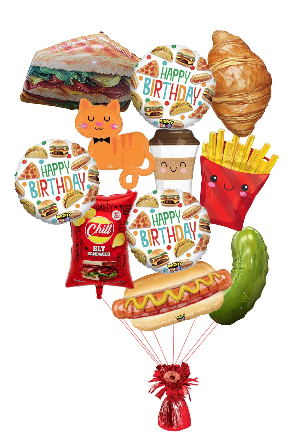 Our NYC Bodega Bouquet has everything you need to enjoy your birthday right! Stands 6 to 7 feet tall and floats for multiple days indoors. Chopped Cheese not included!