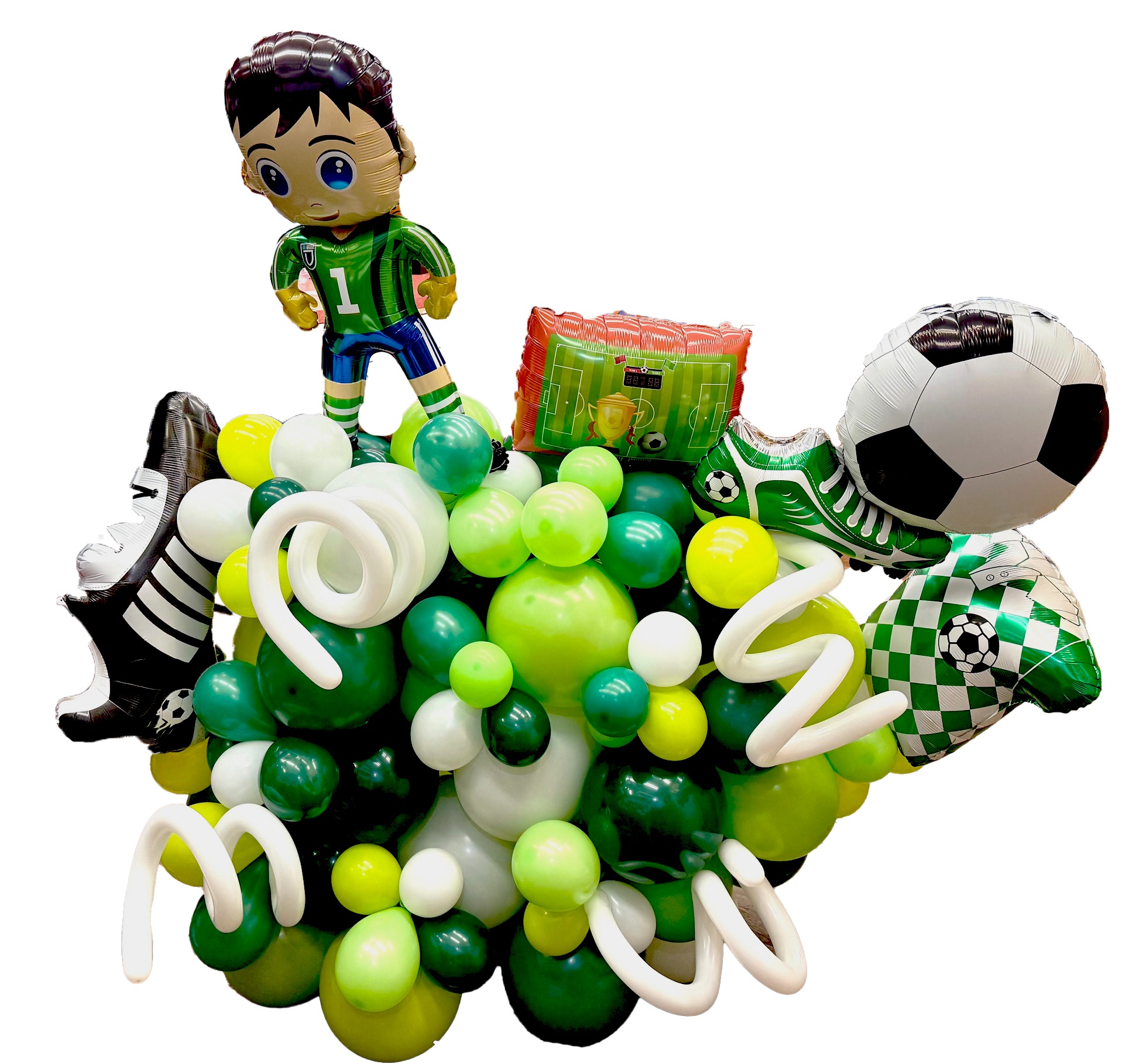 Have a ball with our Soccer Sculpture! Made with an assortment of Soccer mylar balloons and multi colored latex balloons. Stands 4 feet tall by 4 feet wide lasts for multiuple days indoors.