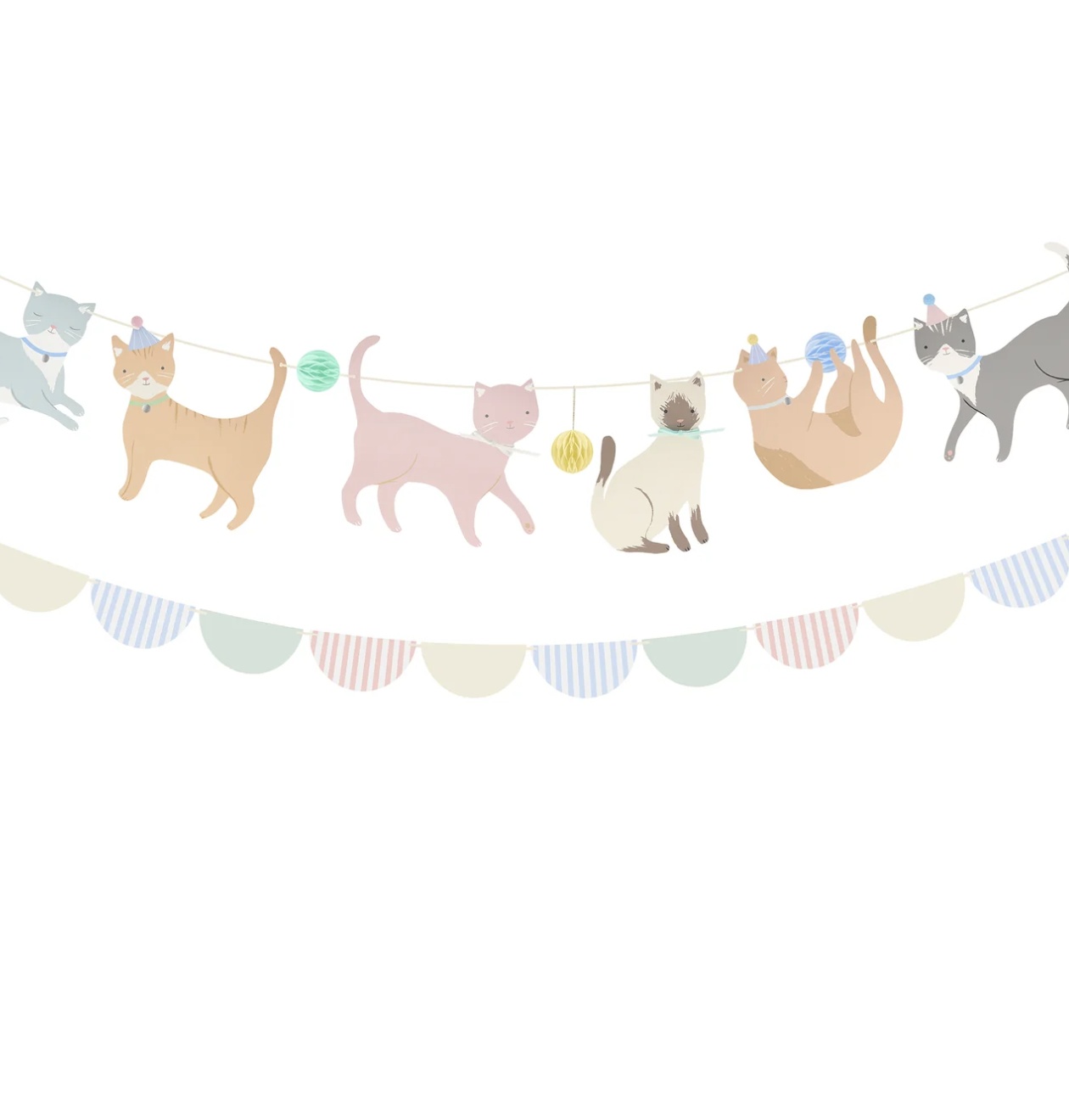 Garland features 6 kittens, 5 tissue paper honeycomb balls and a scalloped garland with 12 pennants