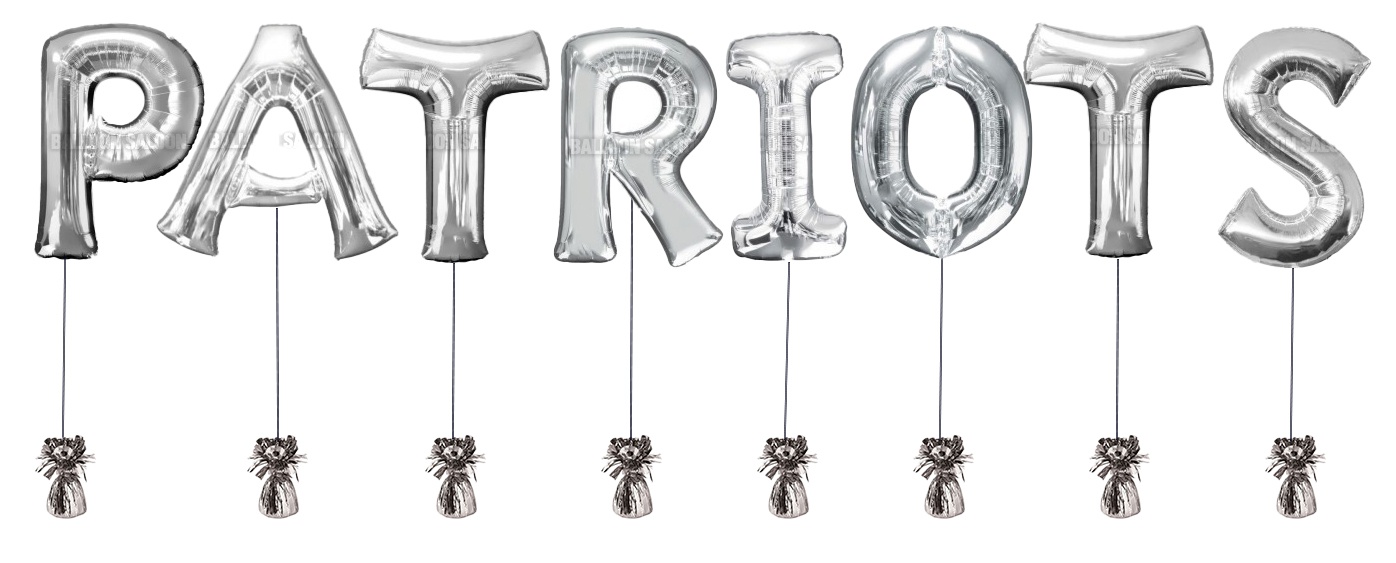 Show your team pride with our PATRIOTS balloon banner. Each letter is 40 inches tall by 26 inches wide, and floats for multiple days when used indoors. Available in Silver or Gold.